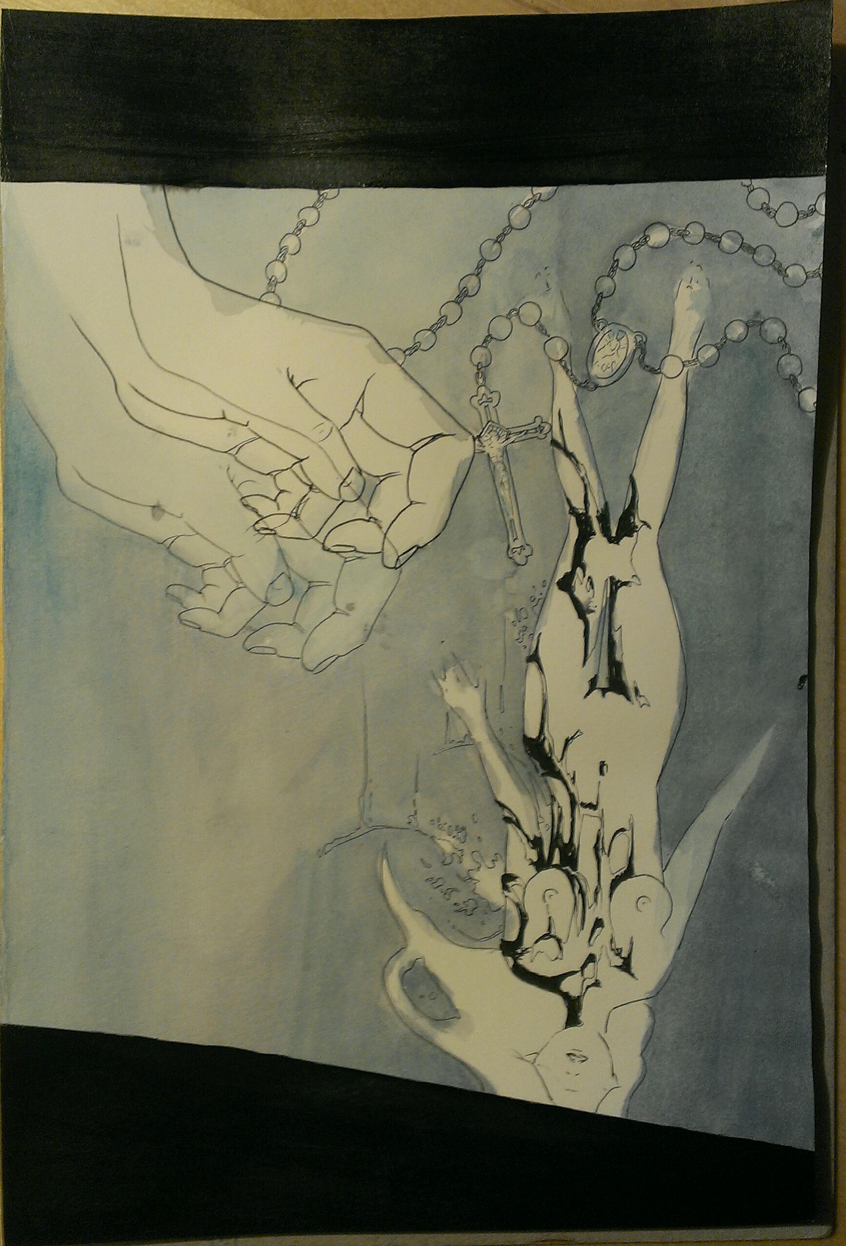 Ich habe nun das Wochenende an dem Bild gearbeitet und es daher relativ schnell fertig stellen können. Nachdem ich wie geplant alle Elemente mit Buntstiften coloriert hatte, empfand ich das obere linke Bildviertel als eher leer und hell, weshalb mir der Gedanke kam, es mit Schrift aufzufüllen. Da ich jedoch Angst hatte, das fertige Bild zu ruinieren, habe ich es zunächst einen Tag lang nicht angerührt, bis mein Freund auf die Idee kam, am Pc Schrift einzufügen um zu sehen, wie das Endergebnis aussehen könnte. Dieser Test hat mich dann letztendlich überzeugt und somit habe ich nun doch noch dieses graphische, handschriftliche Element mit übernommen und bereue meinen Schritt auch keines Wegs.