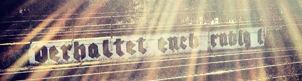 Auf meinem Weg zur Uni fahre ich regelmäßig an folgendem, in Frakturschrift geschriebenen Satz vorbei: „Verhaltet euch ruhig!“ und das sogar mehrmals. Irgendwann habe ich mal im Internet geforscht, worum es sich dabei eigentlich handelt, so dass ich auf die verantwortliche Künstlergruppe Zelle Asphaltkultur gestoßen bin.